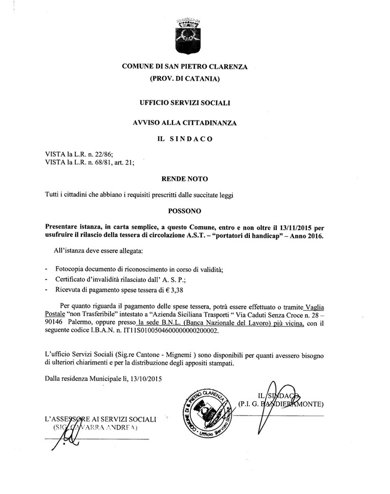 Entro il 13 novembre 2015 i portatori di handicap possono fare richiesta di rilascio della tessera di circolazione gratuita sui mezzi dell' A. S. T. per l'anno 2016.